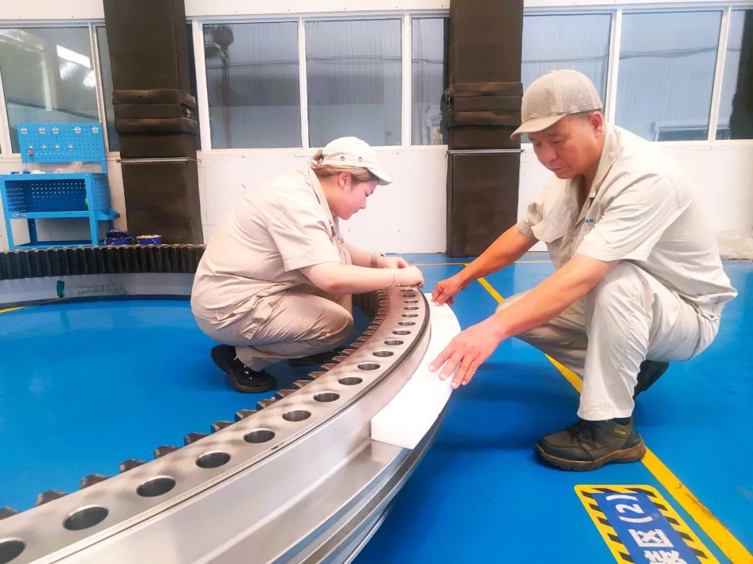 此次,洛軸為其批量配套的產品主要應用于風機的偏航、變槳兩個部位,其產品外徑尺寸最大達到5.6m,單重超過13噸。為確保產品順利研發,洛軸研發生產團隊,針對產品使用工況特殊要求,結合前期積累的研發制造經驗,運用新工藝、新技術,確保產品順利加工。尤其是針對變槳軸承淬火工藝要求高,內圈徑向滾道為凹槽型,加工難度大等問題,運用獨創加工方法,反復試驗,不斷攻堅,最終滿足徑向滾道淬硬層符合要求,還兼顧提升了軸向滾道淬火后與擋邊交界處質量。同時,加工過程中,洛軸還對徑向滾道直線性及粗糙度等進行了嚴格的質量管控,確保了產品裝配一次合套成功。